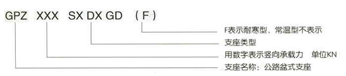 GPZ(II)15SXF:表示GPZ系列中设计承载力为15MN的双向(多向)活动的耐寒型盆式支座。