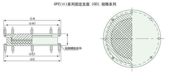 固定支座由上座板、密封圈、橡胶板、底盆、地脚螺栓和防尘罩等组成。