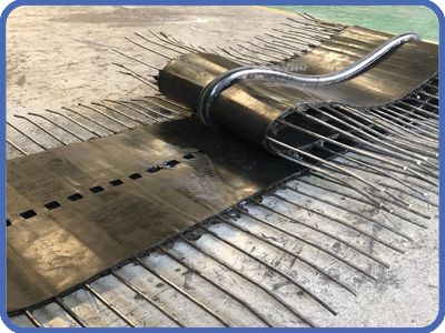 植入式桥面连续装置是我公司生产的一种用于桥梁结构的产品,也叫桥面橡胶止水带,属于止水带的一种,是应用于梁桥上的,它包括拱形结构,拱形结构的两侧设有用于和桥面梁体连接的安装面,拱形结构的上方沿宽度方向间隔一定距离设有工字梁形状的肋条。高弹性植入式桥面连续装置,植入式桥面连续装置,桥面止水带包含弹性资料制成的板,所述板的中心或接近中心的部位的反面设有排水槽,所述板上开设有与排水槽相通的落水口。本创造可在浇筑桥面混凝土调平层前一次性预埋设备在相邻梁体的接连处,浇筑混凝土时又能够作为浇筑的底模,避免混凝土浆液下渗,而且不再需求别的设备底模。在完结桥面沥青层铺装后,因为弹性板自身的抗拉抗弯折功能,关于因为温度引起的弹性以及因为活荷载引起的转角效应,本设备不易被损坏。在弹性板反面的排水槽,能够使得桥面即便发生裂缝后,渗落的雨水能够及时从桥梁两边排出,有助于避免桥面沥青层水损坏的发生,也杜绝了盖梁遭到雨水损害的问题,增强了盖梁的耐久性,确保了桥梁结构的安全。