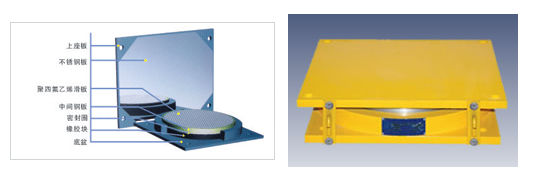 双向(多向)活动支座和单向活动支座由上座板(包括顶板和不锈钢滑板)、聚四氟乙烯滑板、中间钢板、密封圈、橡胶板、底盆、地脚螺栓和防尘罩等组成。单向活动支座沿活动方向还设有导向挡块。